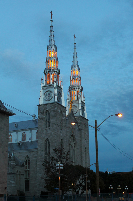 Residents on the west side of ‪Lowertown‬ have an interactive art work in their sights 24-7. The colour and brilliance of the spires of Notre-Dame Cathedral transform continuously. On bright summer days, they reflect blindingly white rays. They turn peach at sunrise and mauve at sunset. They’re often sterling silver or steel grey. Rarely, they appear green–which they were for a fleeting few minutes this morning. And, at dusk, we often enjoy this wondrous sight–the interior of the spires alight in gold.
