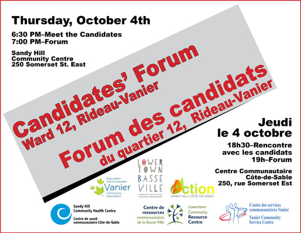 Candidates Forum / Forum des candidates – October 4, Sandy Hill Community Centre/Centre communautaire de côte de sable – Lowertown Community Association/Association communautaire de la Basseville; Action Sandy Hill/Action Côte de sable; Vanier Community Association/Association communautaire Vanier, Centre de ressources commuautaires de la Basse-ville/Lowertown Community Resource Centre; Centre des services communautaires Vanier/Vanier Community Service Centre